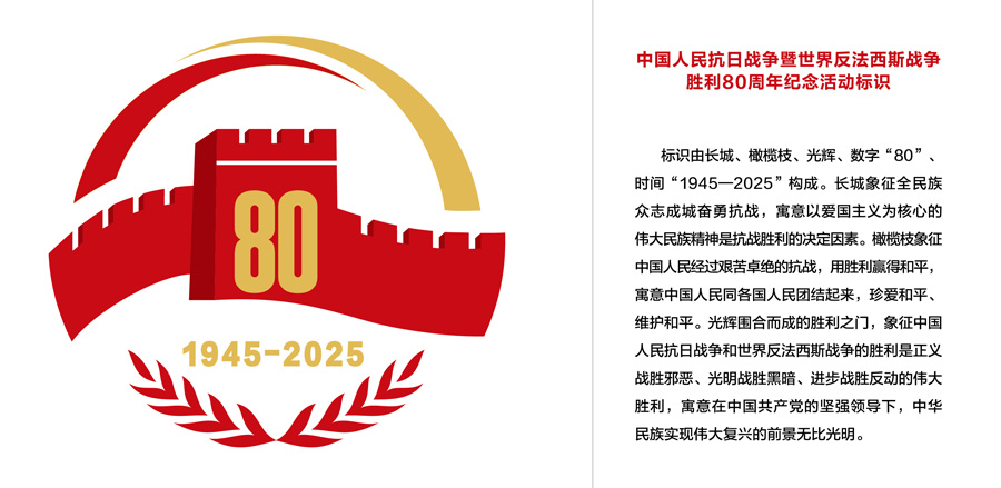 标识由长城、橄榄枝、光辉、数字“80”、时间“1945-2025”构成。长城象征全民族众志成城奋勇抗战,寓意以爱国主义为核心的伟大民族精神是抗战胜利的决定因素。橄榄枝象征中国人民经过艰苦卓绝的抗战,用胜利赢得和平,寓意中国人民同各国人民团结起来,珍爱和平、维护和平。光辉围合而成的胜利之门,象征中国人民抗日战争和世界反法西斯战争的胜利是正义战胜邪恶、光明战胜黑暗、进步战胜反动的伟大胜利,寓意在中国共产党的坚强领导下,中华民族实现伟大复兴的前景无比光明。