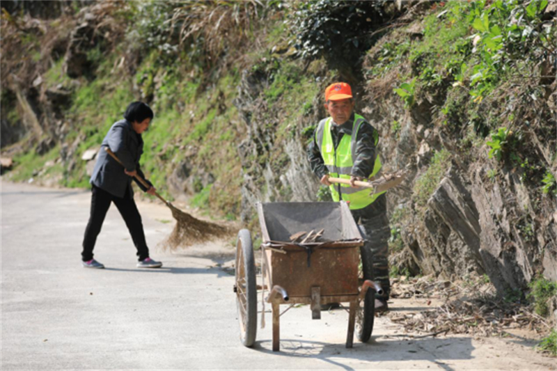 王诗进和老伴儿推着独轮车沿路清扫。图片来源:中国新闻网