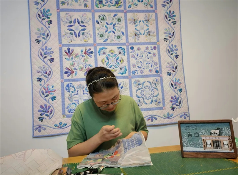 陈木兰在认真制作刺绣作品。新华社记者 俞俭 摄